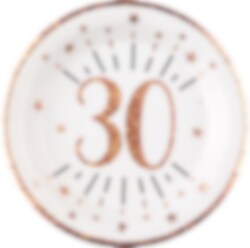 10 glitrende hvite papptallerkener med kant i roségull og tallet "30" i roségull. Disse tallerkenene er elegante og perfekte for borddekking ved en 30-års bursdagsfest. Med en diameter på 22,5 cm, tilfører de et spesielt preg til festbordet. Kombiner dem gjerne med annet festlig borddekkingstilbehør i 30-års tema.