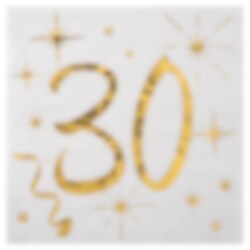 20 stk. hvite servietter med dekorative mønstre og tallet 30 i gullfolie. Disse serviettene er perfekte når du dekker til en 30-årsfest. Serviettene har tre lag og føles luksuriøse. Sammenbrettet har de en størrelse på 12,5 x 12,5 cm.