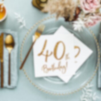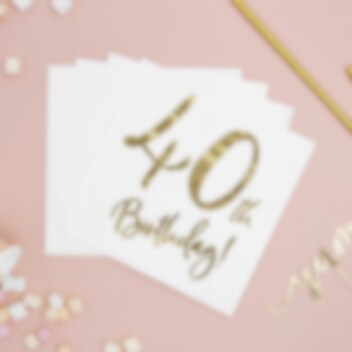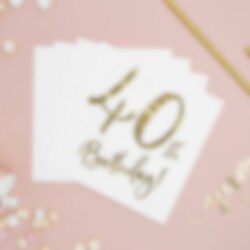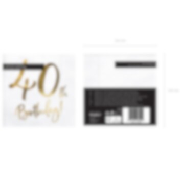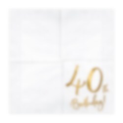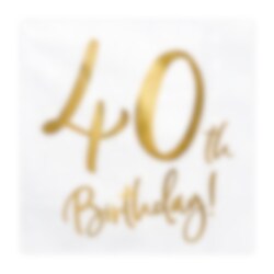 20 stk. hvite servietter med gullfolietrykk hvor det står "40th Birthday!". Fine å plasser på det festbordet til 40-årsfesten. Serviettene er i standardstørrelse, ca. 33 x 33 cm utbrettet.