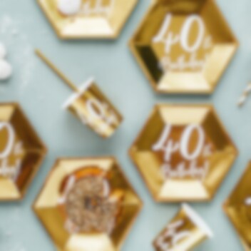 6 stk. gullfolierte papptallerkener med teksten "40th Birthday!" i hvit. Fine å dekke bordet med til 40-årsfesten. Tallerkenene er ca. 20 cm store.