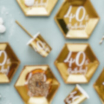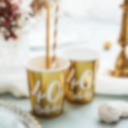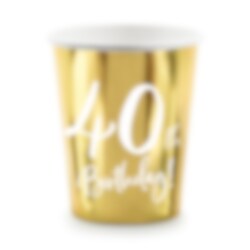 6 stk. pappkopper i en flott gullmetall farge og med teksten "40th Birthday!" med hvitt trykk på. Fint til å dekke bordet med når det er tid for at feire 40 år! Koppene rommer ca. 2,2 dl.
