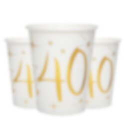 10 stk. hvite pappkopper med dekorative stjerner og tallet 40 i gullfolie. Disse koppene er virkelig vakre og et perfekt innslag til 40-årsfestens dekking. Koppene er 10 cm høye og rommer 270 ml.