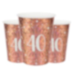 10 stk. glitrende pappkopper i rosegull med tallet "40" på. Disse koppene er virkelig vakre og utgjør den perfekte dekorasjonen til borddekkingen for en 40-årsfest. Koppene er omtrent 10 cm høye og har en kapasitet på rundt 270 ml. Kombiner disse koppene med andre elegante dekorasjoner og tilbehør for en 40-årsfest. Ta en titt på vår kategori for 40-årsfest for mer inspirasjon.