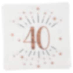 10 stk. hvite servietter med glitrende mønstre i roségull og tallet "40". Disse serviettene er elegante og ideelle for en 40-års bursdagsfest. Med tre lag gir de en luksuriøs følelse.