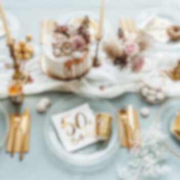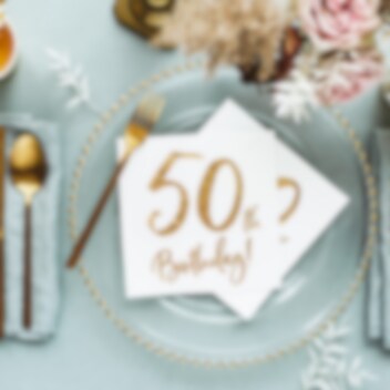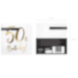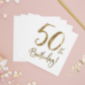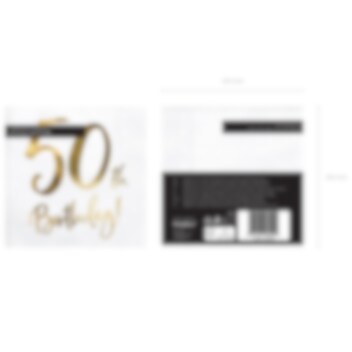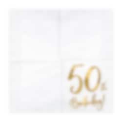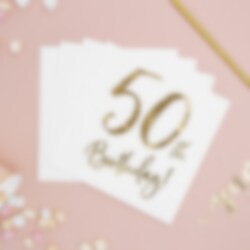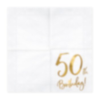 20 stk. servietter i hvitt med gullfolietrykk hvor det står "50th Birthday!". Fine servietter å dekke bordet med når det er tid for å feire 50-årsdag. Serviettene er i standardstørrelse, ca. 33 x 33 cm utbrettet.