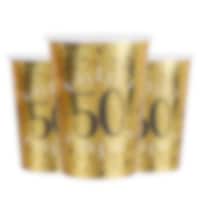 10 glitrende papptallerkener i gull med tallet "50" i svart. Disse tallerkenene er vakre og ideelle for borddekking ved en 50-årsfest. Tallerkenene har en diameter på 22,5 cm. Kombiner dem gjerne med annet festlig borddekkingstilbehør i 50-års tema.