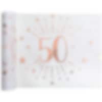 Flott bordløper som glitrer med dekorative mønstre i rosagull og tallet "50". Denne praktiske bordløperen leveres på rull, er 30 cm bred og 5 meter lang – nok til flere bord og en stor fest. Laget av 100% polyester, tilfører den eleganse til enhver borddekking. Kombiner den med annet stilig tilbehør for en 50-års temafest. Ta en titt i vår kategori for 50-årsfest for å få mer inspirasjon. Du vil også finne et bredt utvalg av vakre dekorasjoner i rosagull som perfekt kompletterer denne bordløperen.