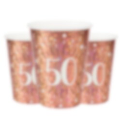 10 stk. glitrende pappkopper i rosegull med tallet "50" på. Disse koppene er virkelig vakre og utgjør den perfekte dekorasjonen til borddekkingen for en 50-årsfest. Koppene er omtrent 10 cm høye og har en kapasitet på rundt 270 ml. Kombiner disse koppene med andre elegante dekorasjoner og tilbehør for en 50-årsfest. Ta en titt på vår kategori for 50-årsfest for mer inspirasjon.