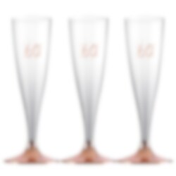 6 stk. vakre og praktiske plastchampagneglass for 60-års jubileumsfeiring. Disse glassene er ideelle for å dekke bordet og for å mingle med gjestene på festen. Hvert glass rommer 14 cl og står på en roségullfot, prydet med tallet "60" på toppen.