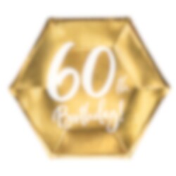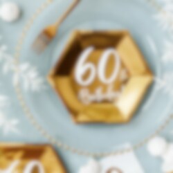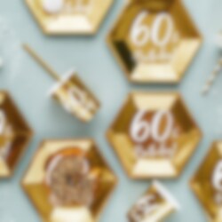6 stk. gullfolierte papptallerkener med teksten "60th Birthday!" i hvit. Perfekt å dekke bordet med til 60-årsfest. Tallerkenene er ca. 20 cm store.