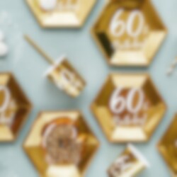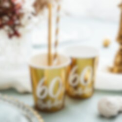 6 stk. papkopper i flott gullmetallisk farge med teksten "60th Birthday!" med hvitt trykk på. Perfekt til å dekke bordet til 60-årsfest. Koppene rommer ca. 2,2 dl.