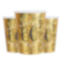 10 glitrende papptallerkener i gull med tallet "60" i svart. Disse tallerkenene er vakre og ideelle for borddekking ved en 60-årsfest. Tallerkenene har en diameter på 22,5 cm. Kombiner dem gjerne med annet festlig borddekkingstilbehør i 60-års tema.