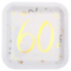 10 stk. hvite papptallerkener med dekorative mønstre og tallet 60 i gullfolie. Disse firkantede tallerkenene er et fint innslag til 60-årsfestens dekking. Tallerkenene er 23 x 23 cm store.