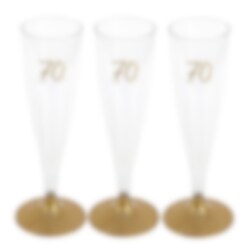 6 stk. vakre og praktiske plastchampagneglass for 70-års jubileumsfeiring. Disse glassene er ideelle for å dekke bordet og for å mingle med gjestene på festen. Hvert glass rommer 14 cl og står på en gullfot, prydet med tallet "70" på toppen.