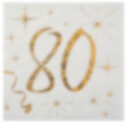 20 stk. hvite servietter med dekorative mønstre og tallet 80 i gullfolie. Disse serviettene er perfekte når du dekker til en 80-årsfest. Serviettene har tre lag og føles luksuriøse. Sammenbrettet har de en størrelse på 12,5 x 12,5 cm.