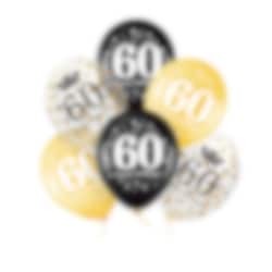 Feir 60-årsdagen med stil! Dette ballongsettet inneholder to svarte, to gullfargede og to gjennomsiktige ballonger med konfetti, alle med et flott 60-trykk som setter prikken over i-en på festdekorasjonen.
