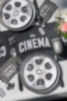 Svart bordløper med den stilfulle teksten "The Cinema". Bordløperen er perfekt hvis du vil arrangere en Hollywood-temafest eller en begivenhet der film og filmskaping er i sentrum.