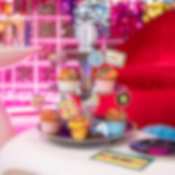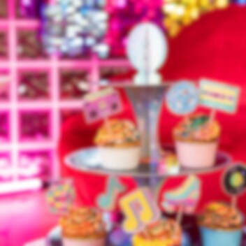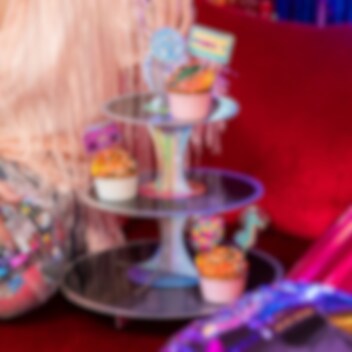Gi festen en glitrende touch med dette spektakulære muffinsstativet i discotema. Med tre etasjer og en skinnende discokule på toppen blir den et perfekt midtpunkt på dessertbordet. Stativet er 39 cm høyt og 34 cm bredt, utformet for å fremheve dine muffins og bakverk på en festlig måte. Et must for alle som elsker disco og bursdagsfester med stil.