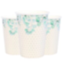 10 stk. pappkopper med dekorative gullprikker og et mønster av bladverk i grønne fargetoner. Koppene er ca 10 cm høye og rommer 270 ml.