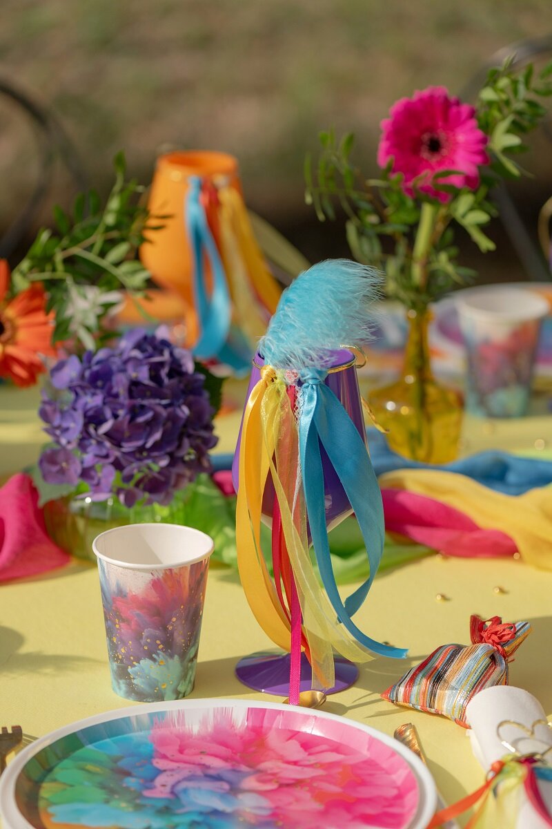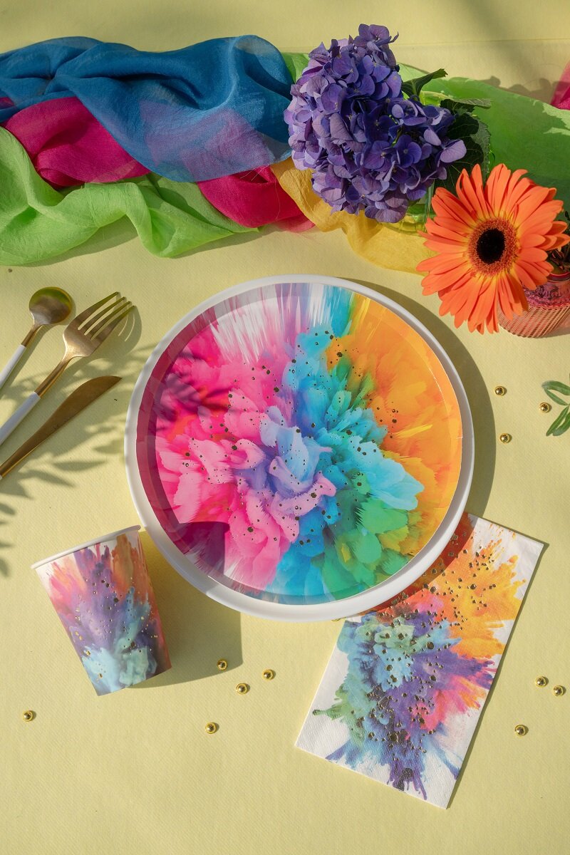 Fargerike servietter som passer perfekt til bursdag, fest og andre feiringer der borddekkingen kan skille seg ut. Det fargesprakende mønsteret i klare nyanser sammen med de glinsende gulldetaljene skaper et livlig og dekorativt uttrykk.
