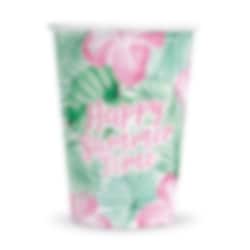 Server forfriskende drikker i disse sommerlige pappkoppene med tropisk motiv. Med grønne blader, rosa blomster og teksten Happy Summer Time blir de en fargerik detalj på borddekkingen og passer perfekt til sommerfest, poolparty eller fest i tropisk stil.
